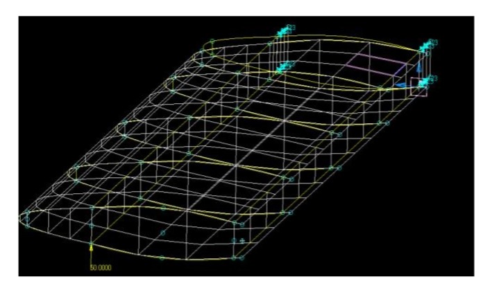 The meshing is composed of a series of 2D shell elements (for surfaces), 1D bar elements (for flanges of spars) and 360 nodes (for a simplified model).