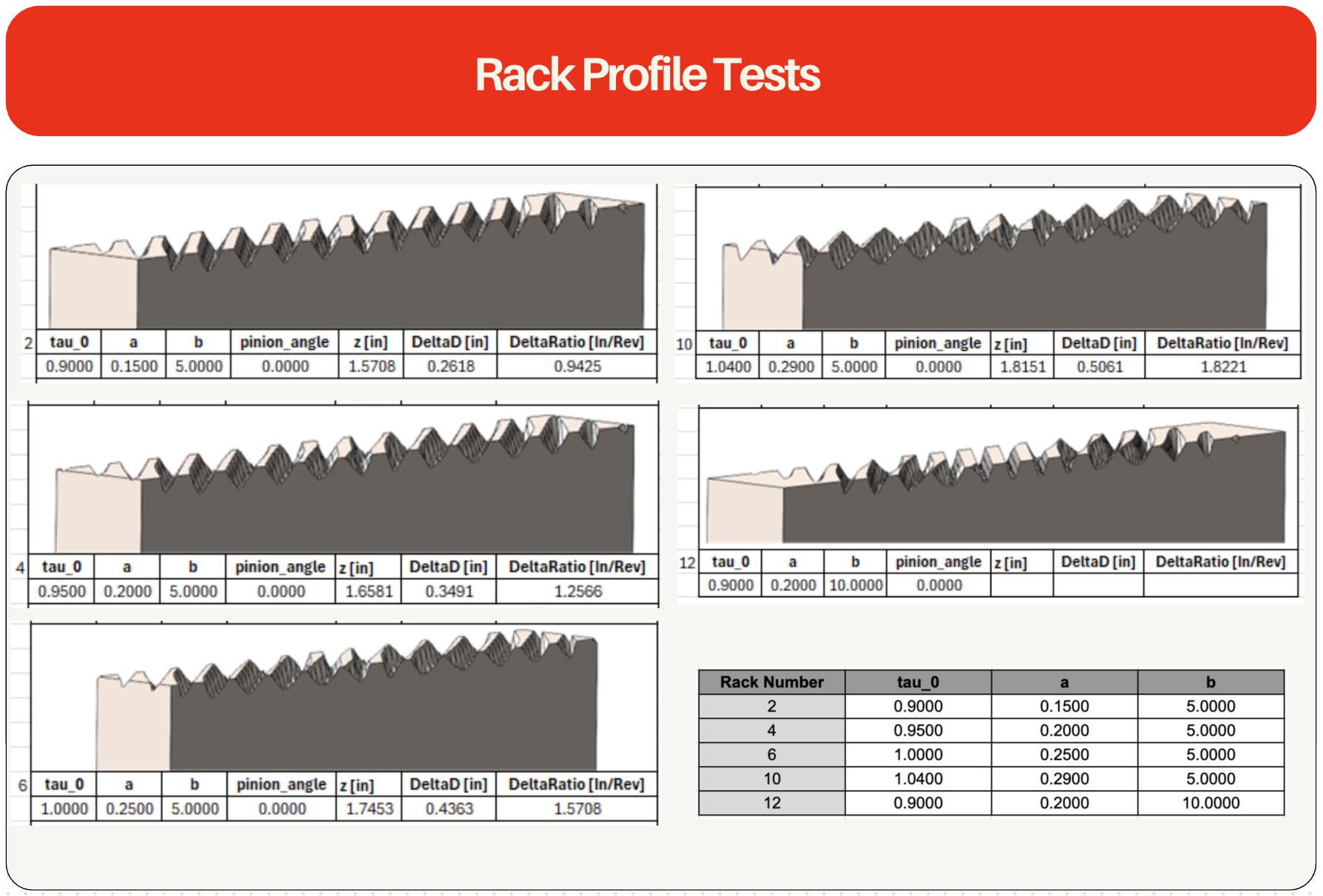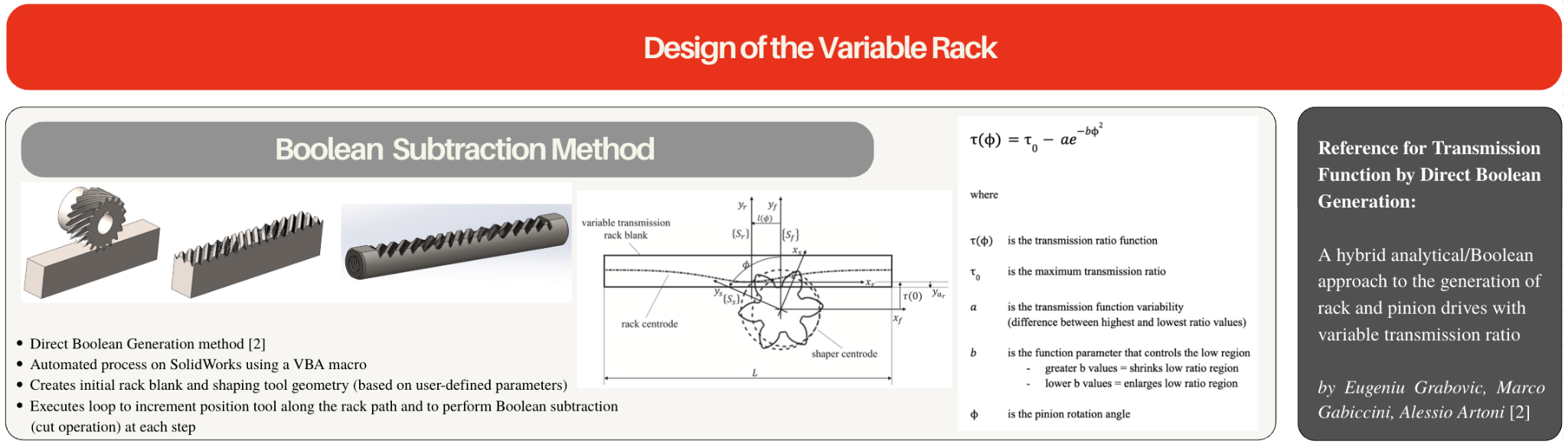 We used the vehicle's current relevant geometry (steering column length, tie rod length, steering arm length, kingpin inclination angle, Ackerman geometry, caster, angle, camber angle, track width, wheelbase, inner and outer steering angles, steering axis offset, toe angle, maximum turning angle of steering wheel, etc.) to create a MATLAB code which outputs the most efficient variable transmission function. This function measures the angle of the pinion (as it turns and meshes with the rack) relative to the angular velocity of the pinion. The generated data from the transmission curve was then uploaded into SolidWorks, where a multi body representation of the pinion travel was generated. Following, the Combine feature was used to subtract the bodies in order to generate the pinion’s cutout path.